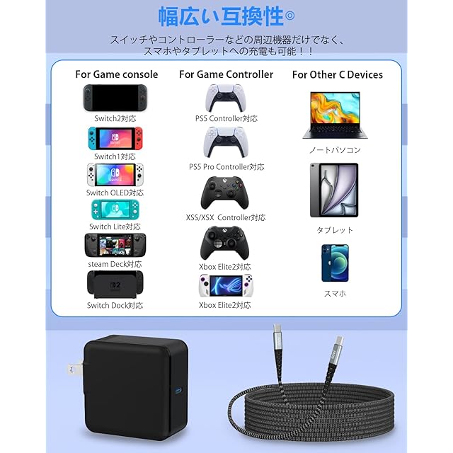 【幅広いデバイスに対応】本製品は最大60W出力のACアダプターで、USB-Cポートを採用する最新世代のポータブルゲーム機(2025年発売モデルを含む)、従来モデルや携帯型ゲーム機、ドック型周辺機器などにも対応。接続されたデバイスを自動で判別し、最適な電力を供給するため、複雑な設定は不要で差し込むだけで急速充電が可能です。さらに、iPhone 16シリーズ、15シリーズ、Galaxy S25/S24/S23シリーズ、Pixel などUSB Type-C対応スマートフォンやタブレットにも幅広く対応しています。
