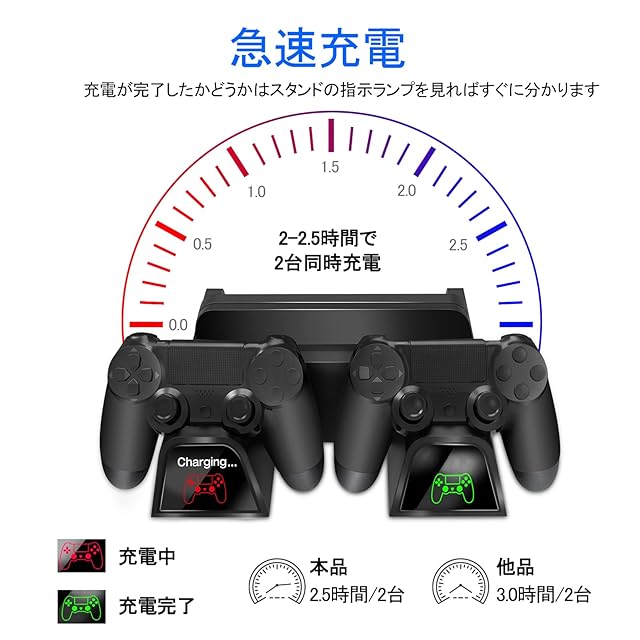 【2-2.5時間PS4コントローラー急速充電】EXTポートで充電し、2-2.5時間急速充電でき、充電インジケーターは充電中に赤く点灯し、充電完了すると赤から緑へ切り替ります。充電完了かどうかがひと目でわかります。