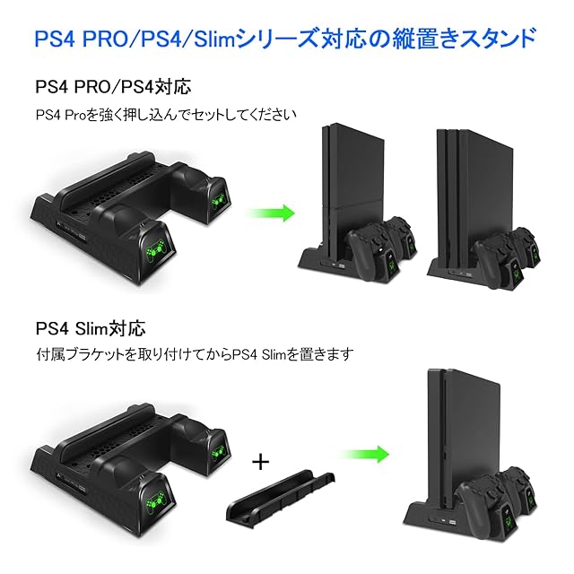 【全機種対応PS4縦置きスタンド】PS4スタンドは付属部品を使用することで、通常版のPS4からPS4 Pro、PS Slimまで、幅広い種類が対応しています。冷却ファン・コントローラー充電・USBハブ機能の他に、12枚分のソフトの収納までできる多機能な縦置きスタンドです。