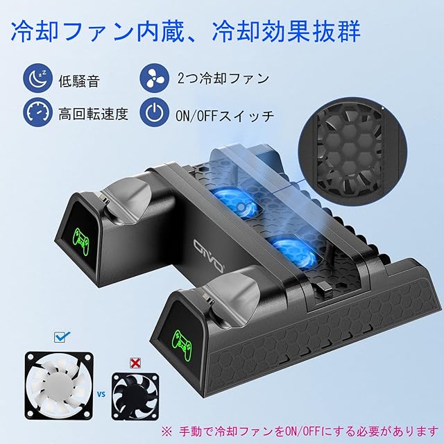 【排熱効率を上げる冷却ファン】本体の熱を逃がすことができる冷却ファンは2基搭載。空気流入位置があるので、効率的にPS4の熱を取り除けます。ファンのON・OFFはサイドのスイッチ一つの簡単操作です。