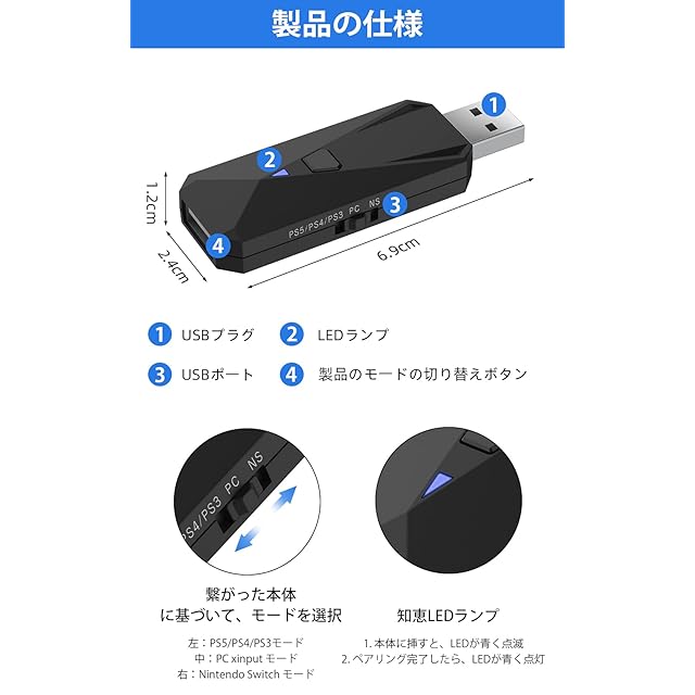 ✨「使い方簡単」:このコントローラーコンバーターは日本語取扱説明書に従って、接続方法がとても簡単です。プログラムやドライバーをインストールせずに、ゲーム機のUSBポートに挿して、真ん中のペアリングボタンを押さえながら、コントローラーのペアリングボタンを押します。何も触れずそのまま待って接続できます。