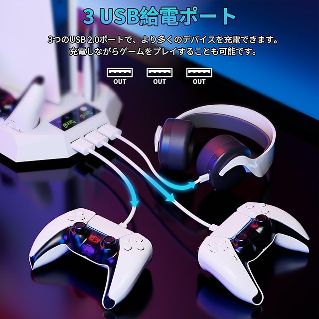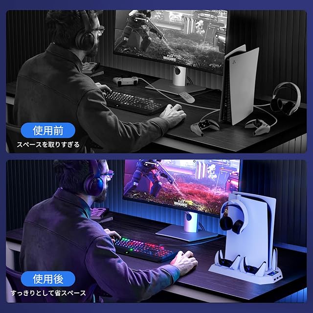 【コンパクト収納】PS5縦置きスタンドは収納が便利で、省スペースで、デスクトップがスッキリします。PS5ゲームスタンドは、コントローラー2台・PS5本体・リモコン・ヘッドセットをまとめて収納可能。さらに3つのUSBポートを装備し、マウスやヘッドホンなどの周辺機器の充電や接続に便利です。PS5スタンドはお手入れも簡単。汚れが気になる時は、乾いた布で軽く拭くだけでOKです。この冷却スタンドは軽量で多用途に使えるため、PS5 ゲーム愛好家に最適です。