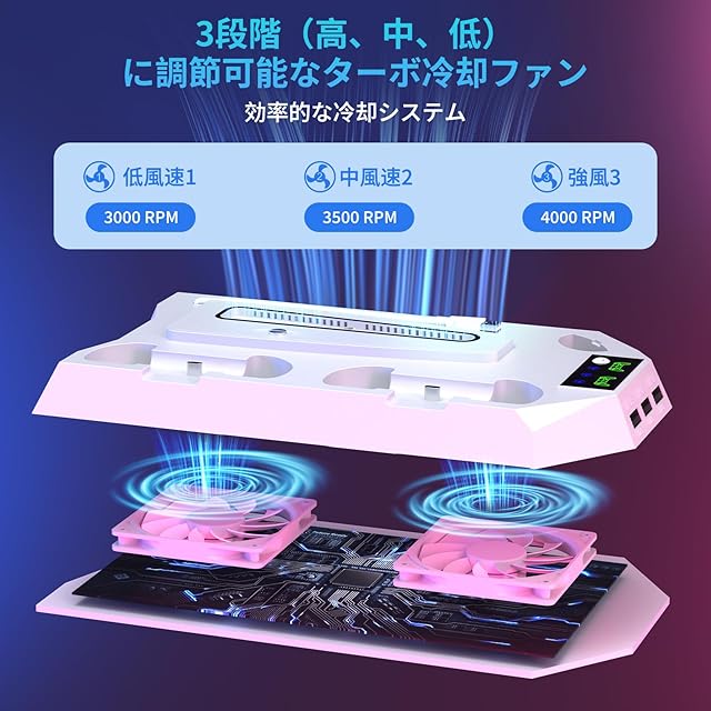 【3段階風速調整の冷却ファン】このps5 縦置きスタンド 、高速冷却ファン内蔵され、 強力な放熱により、コンソールの内部熱を素早く排出します。3段階(高、中、低)に調節可能なターボ冷却ファンを内蔵し、3000/3500/4000 RPMの回転数を実現。放熱効果を高め、長時間のゲームプレイでもPS5を効率よく冷却します。PS5コンソールを効果的に冷却し、動作寿命を延ばします。ps5 冷却ファン は静音冷却により、より安定した滑らかなゲーム体験を楽しむことができます。