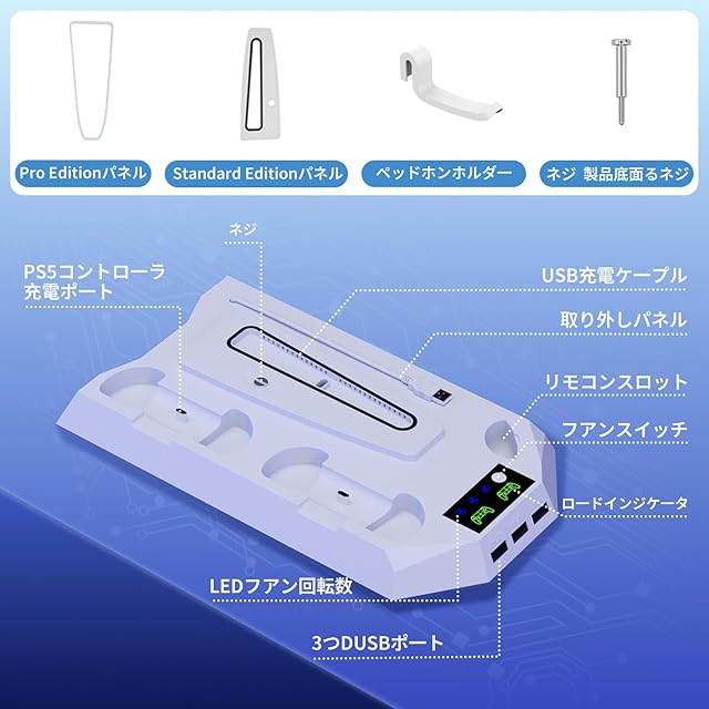商品名:PS5 Pro/PS5/PS5 Slim対応 縦置きスタンド 【冷却ファン·多機能収納】急速充電 PS5冷却ファン 3段階風速調整 コントローラーデュアル适用 放熱対策 過充電防止 充電指示ランプ付 PS5 周辺 スタンド PS5/PS5 Pro/PS5 Slim ディスク/デジタル版機種対応 (ホワイト)
