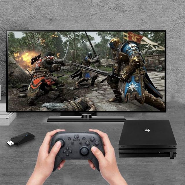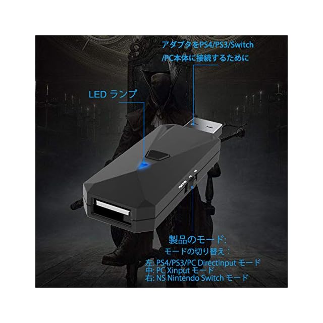 <b>本製品はPS4とSwitchのゲームをPS5/PS4やPS3、Switch pro、Xbox One Sなどの使い慣れたコントローラで遊べる変換アダプタです</b><br><br> <b>対応ゲーム機本体:N-Switch、PS5/PS4/PS3、PC、本体 アダプタの側に付いてるボタンはモードを選ぶ用である モードの切り替え:PS4/PS3 - PC - NS</b><br><br> <b>「技適認証済み」ご安心してお買い求め下さいませ</b><br><br> <b>接続パターン:</b>有線とブルートゥース接続も対応できます<br><br> <b>無線コントローラがSwitchに使い方:</b><br> PS4ワイアレスコントローラを例として、接続方法を説明しましょう<br> <b>【ケーブル接続】</b><br> 1.SwitchをTVに正しく接続します<br> 2.アダプタの側に設定するモードボタンを「NS」に押して、それからアダプタをニンテンドースイッチドックのUSBポートに挿します <br> 3.コンソールの設定を変えます 設定→コントローラーとセンサー→Proコントローラーの有線通信をONにします<br> 4.有線コントローラーをアダプタに接続します<br> 5.ペアリングが完了しています,スイッチでコントローラを楽しめます<br><br> <b>【ブルートゥース接続】</b><br> 1.SwitchをTVに正しく接続します<br> 2.アダプタの側に設定するモードボタンを「NS」に押して、それからアダプタをスイッチドックの何の暇があるUSBポートに挿します <br> 3.コンソールの設定を変えます 設定→コントローラーとセンサー→Proコントローラーの有線通信をONにする<br> 4.アダプタの「ペアリング」ボタン短押しでペアリングモードにして、青色LEDがすばやく点滅します<br> 5.コントローラーの「Share Ps」を同時に押し、コントローラーのライトバーがすばやく点滅して、 指を離して、コントローラーが自動的にペアリングします<br> 6.ペアリングが完了して,スイッチでコントローラを楽しめます<br><br> <b>無線コントローラがPS4に使い方</b><br><br> Switch Proコントローラー<br> 1.PS4本体を起動します<br> 2.アダプタの側に設定するモードボタンを「PS4/PS3」に押して、それからアダプタをPS4本体の USBポートに挿します 青色LEDがゆっくりと点滅します<br> 3.アダプタの「ペアリング」ボタン短押しでペアリングモードに入って、青色LEDがすばやく点滅します<br> 4.コントローラーの「SYNCボタン」を押して、コントローラーのLEDがすばやく1から4まで順に 点滅して、それから、指を離して、コントローラーが自動的にペアリングします<br> 5.ペアリングが完了して、PS4本体でコントローラを楽しめます<br><br> Xbox One S/X 無線コントローラ<br> 1.PS4本体を起動します<br> 2.アダプタの側に設定するモードボタンを「PS4/PS3」に押して、それからアダプタをPS4本体の USBポートに挿します 青色LEDがゆっくりと点滅します<br> 3.アダプタの「ペアリング」ボタン短押しでペアリングモードにして、青色LEDがすばやく点滅します<br> 4.コントローラーの「XBOXボタン」を押して起動させて、コントローラーのLEDがゆっくりと点滅して、 それから、コントローラー前面の「ペアリング」ボタン長押しで,コントローラーのLEDは点滅から点灯 になる 指を離して、コントローラーが自動的にペアリングします<br> 5.ペアリングが完了して,PS4本体でコントローラを楽しめます