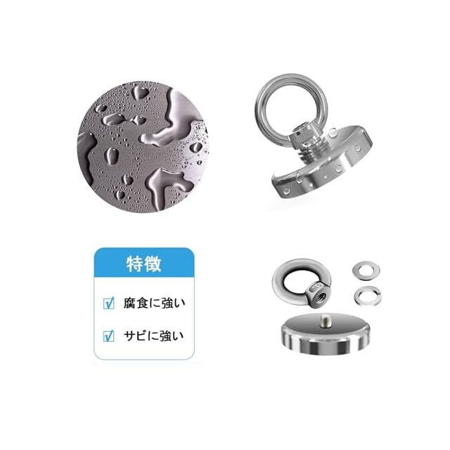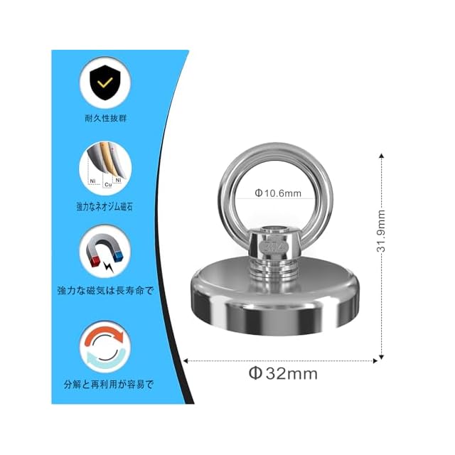 【仕様】サイズ:直径60mm,厚さ15mm,高さ54 mm,重量312g,垂直荷重容量130KG,までの物を簡単に吸収できます。磁気は通常の磁石の5倍。----直径48mm以上の大型リフティングリングの底部には、製品の硬さと支持力を確保するために、黒色エポキシ接着剤注入プロセスが採用されています。