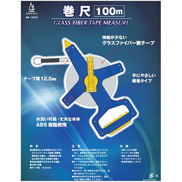 仕様;本体/ABS樹脂、テープ/ガラス繊維、精度/長さの許容差±(0.6+0.4L)mm、標準使用張力/20N