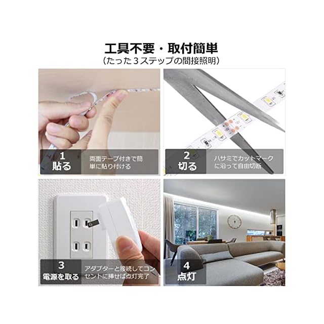 【自由切断可・取付簡単】テープライト自体が柔軟性がある強力両面テープなので、自由に曲がれて好きな形に成りやすくて取り付け簡単です。場所や用途に合わせて、1ユニット(LED6個)単位で自由にカット可能、素人でも楽にできます。ledテープを剥がしても痕がつかない、賃貸の方にもおススメ! ※(ご注意:カットライン以外を切断すると、不点灯となります。残った部分は2ピンの2835コネクタで接続できます。)