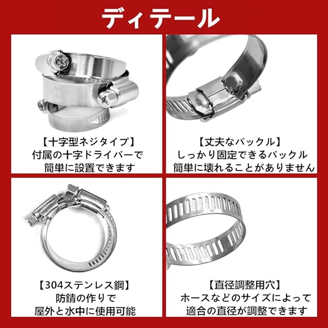 【耐久性が高い材質】材質:304ステンレス鋼。本製品は耐食性に優れた304ステンレス鋼を採用して、密閉を長く保ち、雨がかかる場所で使っても安心してお使いいただけます。ホースクランプは素晴らしい性能、高靭性、抗酸化、耐腐蝕、耐高温800度などの特徴を持っています。強力、確実に締め付け可能です。また、アプリケーションゾーンの周りに均一に圧力を分散するように設計されています。