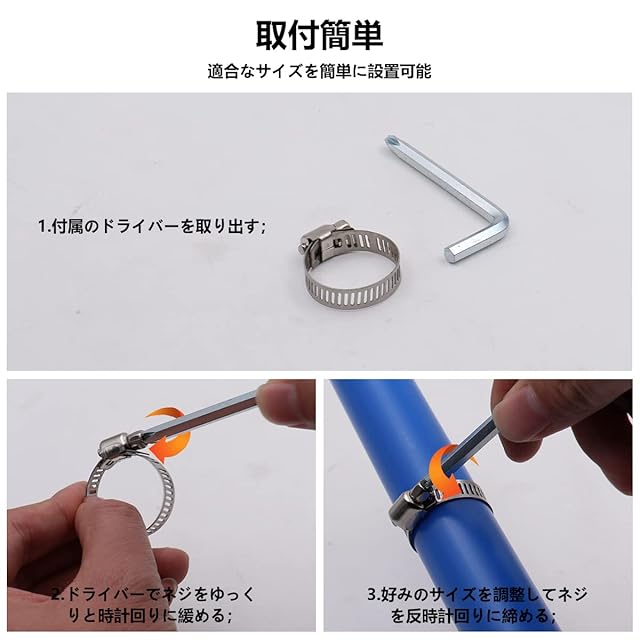 【取付簡単・広い適用範囲】:ネジタイプなので、付属のドライバーで簡単に設置できます。ホースバンドは100個、8種類異なるサイズがあり、屋内温水パイプ/空調パイプ/石油化学輸送パイプライン工業・電子・機動車両・化学工業・農業の軟管固定アプリケーションに広く応用されています。