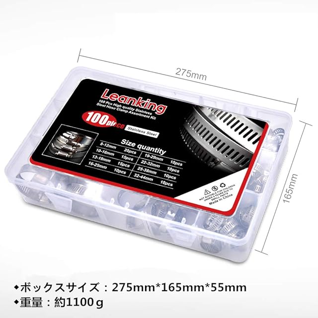 【商品内容と仕樣】セット内容:100個入(サイズ8種類)+ドライバー、ボックスサイズ:27.5*16.5*5.5cm、重量:約1.1kg。直径:8-12mm(20個)/ 10-16mm(15個)/ 13-19mm(15個)/ 16-25mm(10個)/ 19-29mm(10個)/ 22-32mm(10個)/ 25-38mm(10個)/ 32-44mm(10個)