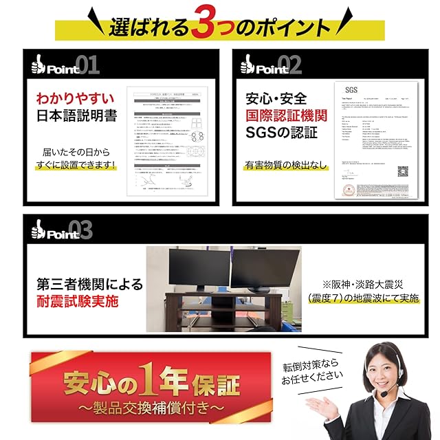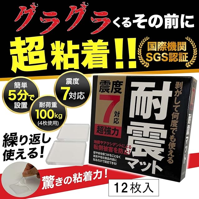 ✅注意事項・家財底面と耐震マットの触れる面積が小さい場合は、耐荷重が少なくなります。 ・本製品で物を吊り下げないでください。 ・フッ素樹脂加工など撥水性のものには使用できません。(セロハンテープがしっかり付く面は使用可)・木材などの凹凸のある面やざらざらした面には適しません。・本製品は地震の被害を最小限に抑える商品です。 本製品使用により発生した破損事故や地震による損害に対して責任を負うものではありません。