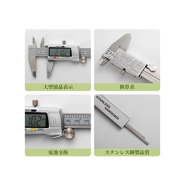 【高品質デジタルノギス】本製品は、本体が高品質のステンレス素材を採用して、丈夫な作りで耐衝撃性、防塵性能などに優れています。深さ測定ブレード、段差測定ブレード、精密な内側と外側の測定ジョーを備えていて、深さ/段差/内径/外径を測定できます。日曜大工など色々な用途で十分使えます。