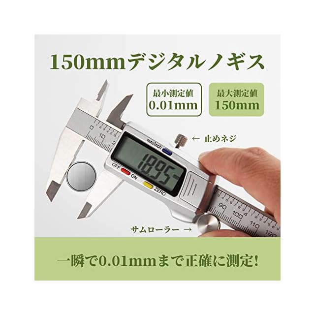 【高精度・微調整機能】測定範囲:0-150mm、最小読取値:0.01 mm、高精度なのでより正確な測定値が得られて、精密作業にお勧めです。mm / inの二つ測定単位を換算でき、簡単で正確に読み取られます。海外製品をよく扱うお方に最適です。※サムローラーで微調整を行うことでカンタンにより正確な測定値を得る可能です。