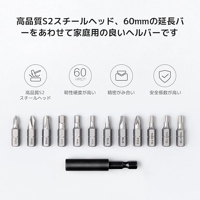 【強力な磁気モーター・12本ビット】 スリープのところに強力マグネットが付いており、異なるビットの装着や切り替えしやすい。作業中にビットと本体緊密繋がり、落ちる心配ありません。12種類のドライバーもあって、持ち運びができます。