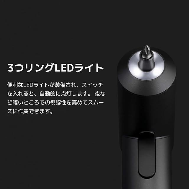 【LEDライト】LEDランプを3つ内蔵し、リングテープを形成し、照明を効果的に提供し、スタートボタンを押すと自動的に照明が起動し、暗くてネジ穴が見にくい場所でも簡単に作業できます。