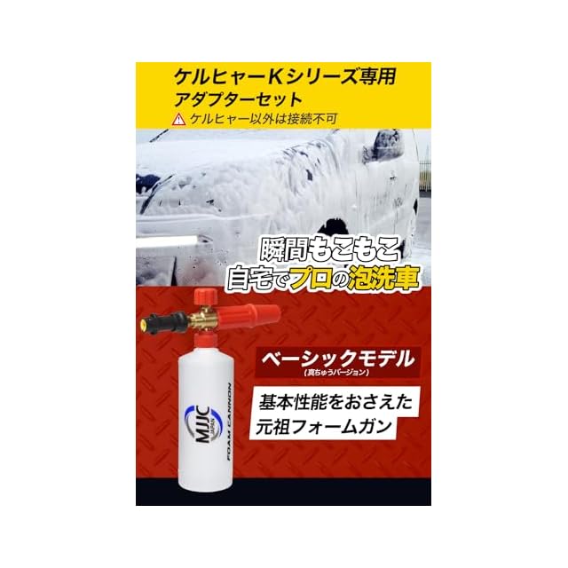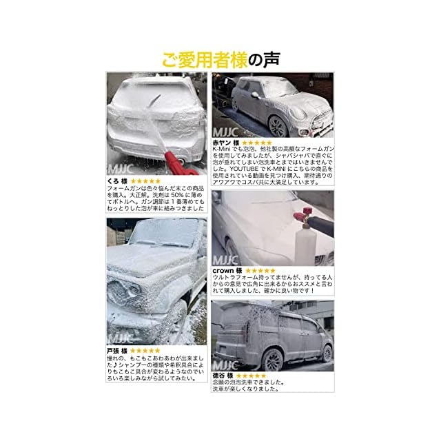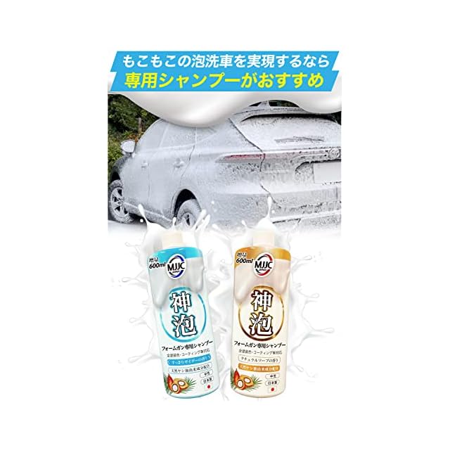 ✅【泡性能を最大限に引き出すためにご確認ください】 ●MJJC純正のフォームガン専用シャンプー【神泡】がおすすめです。●シャンプーの性能により泡立ち具合は変わります。(泡だちの悪いシャンプーもあります。)●MJJC純正のシャンプーを使用しても泡が出ない場合は、以下の内容を見直して下さい。 ・1.1mmまたは1.25mmのノズルがしっかり本体に取り付けられていますか? ・本体に吸引チューブは取り付けられていますか? ・泡量の調節ダイヤルが最小になっていませんか? ・高圧洗浄機は正常に機能していますか? 高圧洗浄機本体の推奨圧力性能は90Bar(9MPa)以上です。この数値を下回る高圧洗浄機でご使用の場合は、付属の1.1mmノズルに交換することにより、最適な泡の状態に近づけることができます。