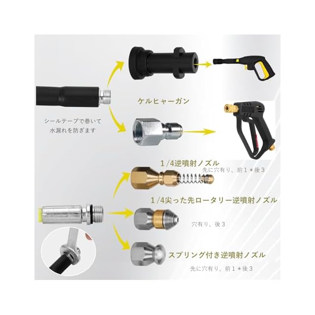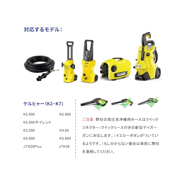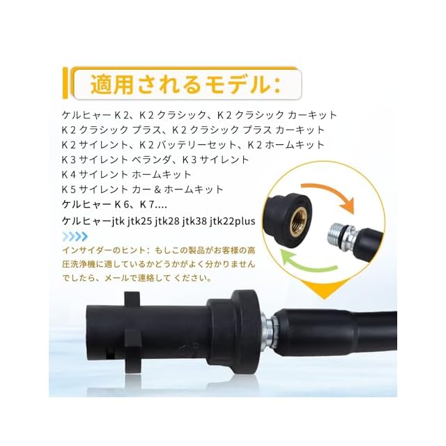 ケルヒャー配管洗浄ホースは、Kシリーズ「K」の黄色と黒のガンアダプターを介して、K2 K4 K5 K6 K7 JTK25 jtk28 jtk38(東・西日本「50Hz」「60Hz」周波数の高圧洗浄機)に使用することが可能です。 ご購入の際は、ケルヒャー高圧洗浄機の型番をご確認の上、お買い求めください。 ケルヒャー排水管 高圧洗浄ホースは、ご自宅、屋外、オフィスの樋、塩ビ管、下水管、雨だれなどの洗浄に適しています。