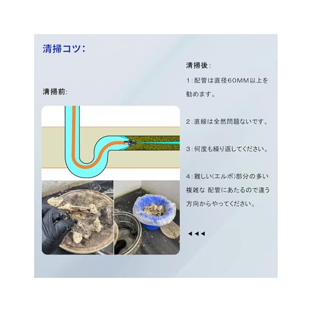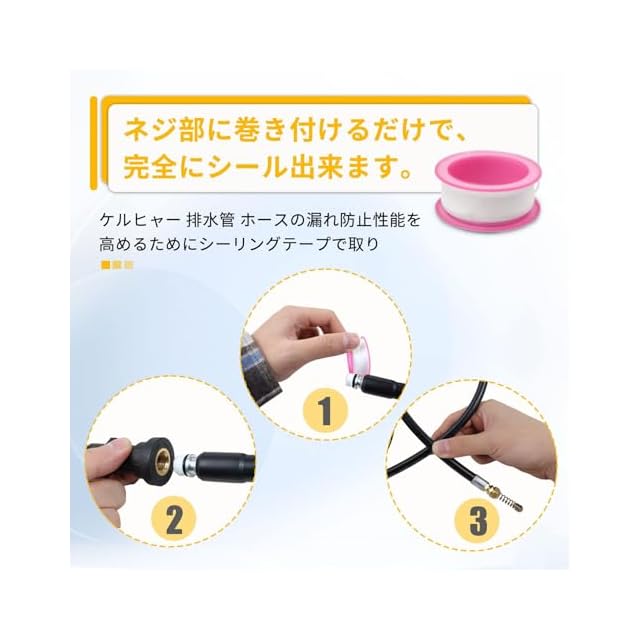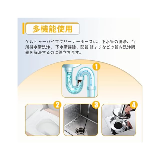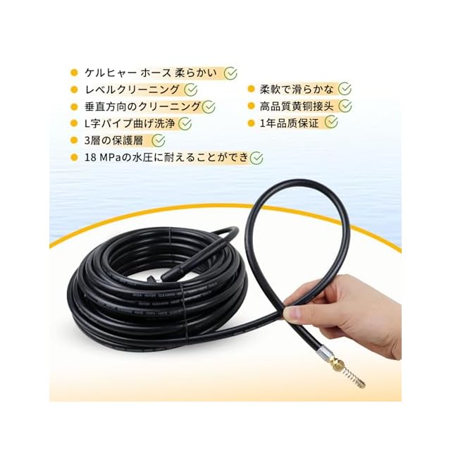 【改善②パイプをおしゃれにしてとともに高品質材料を採用】今度のケルヒャーパイプクリーニングホースは黄色いと青いパイプがあります。洗浄作業にもっと目立つになります。またケルヒャー配管洗浄ホースはPVC素材、表面は高品質ゴム、真ん中は鋼線と繊維でできた防爆層、内層はPU素材です。 圧力を落ない、ねじれにくい硬さを持ってる同時に自由に伸びる柔らかさもあります。最大18 MPaに耐える厚いポリエチレンを採用して、耐久性も強いです。また配管が詰まった時、業者を呼ばなくても自分でやれます!もっと経済的です!