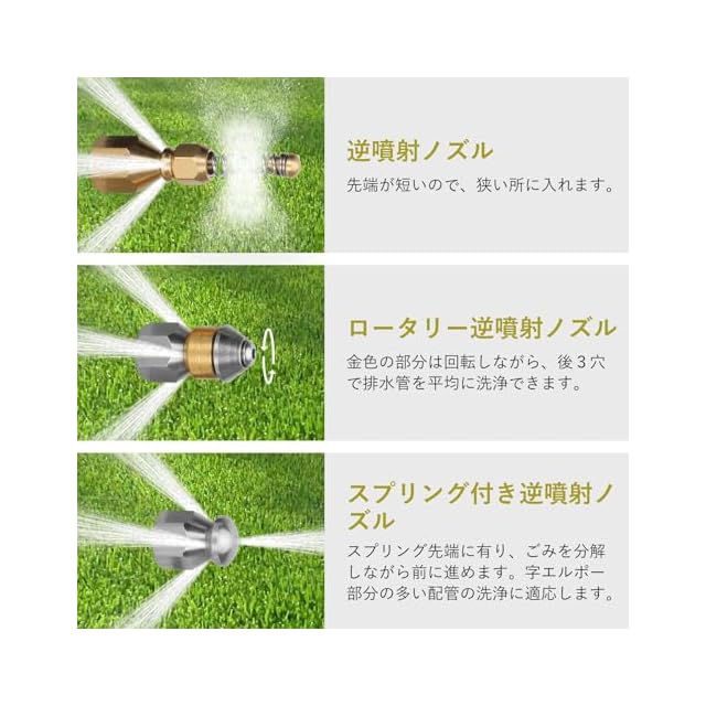 【改善①ノズルの数と形を改善して清掃能力は再び強化されケルヒャー配管洗浄ホース】パイプクリーニングホースは3種類スプレーノズルを持ち、高圧洗浄ホースの清掃と推進能力を備えています。逆噴射ノズルとロータリーノズル先端は平やらな形を改善して尖った形で採用しています。狭いところ、 エルボーの入りをもっと易くなります。スプリング付き逆噴射ノズルにはスプリング先端に有り、ごみを分解しながら前に進めます。孔からと異なる方向から、水を噴射します。これによってパイプは圧力落ず、複雑な配管、枝管から本管まで、配管内の汚れ・詰まりを綺麗に洗浄します。