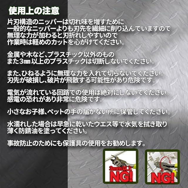 【片刃ニッパーまな刃について】 薄く研がれた切断刃の刃折れを防ぎ、スムーズに最後まで切るために 切断刃よりまな板刃がごく僅かに張り出した作りになっています。 不良などではなく商品の仕様であることをご理解ください ※切断刃を対象物に沿って切ることでほぼフラットに切ることが可能です