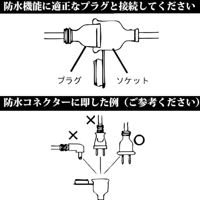 【注意事項】 ※この製品を濡れた手でのプラグなどの抜き差しは決してしないで下さい。 ※プラグはきっちりと差し込んでお使いください。接触不良で発熱する原因となります。 ※コードは束ねて使用したり、上から物を載せないで下さい。焼損の恐れがあり、火災の原因になります。 ※「防雨機能」が有効となるのは、ご使用される機器側も「*防雨対応の電源プラグ」である場合に限ります。 *防雨対応プラグとは直径約3.7cm位の円形のプラグです。 ※本品は『防雨仕様』であり、完全防水製品ではございませんので、大量の水が掛かる場所や水中ではご使用しないでください。