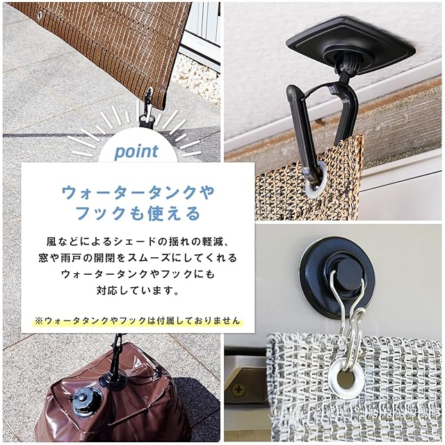 【特徴】日よけや目隠しとして使えるガーデンシェードです。外から入りこんでくる直射日光をやさしく和らげ、室内の温度上昇を緩和し、節電効果も期待できます。水洗いが可能なので汚れた場合も安心です。縦にも横にも使用できるハトメ8個タイプです。