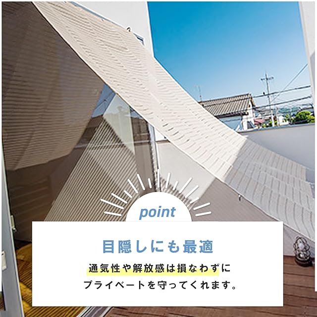 【特徴】日よけや目隠しに便利なガーデンシェードです。カラーはアイボリーです。真夏の暑い日差しを遮り自然の風を取り入れ、エアコンの使用も抑えられるエコなアイテムで、UVカット率も約70%と高いので肌の日焼けや家具や床の劣化も防ぐ事ができます。外からの目隠し効果はあるものの、内部から外部への見通しは良いので圧迫感がありません。またインテリア性もバツグンで、工事不要で簡単に取り付けることができます。汚れてしまっても、水洗い可能なのでお手入れがラクです。