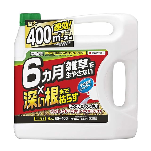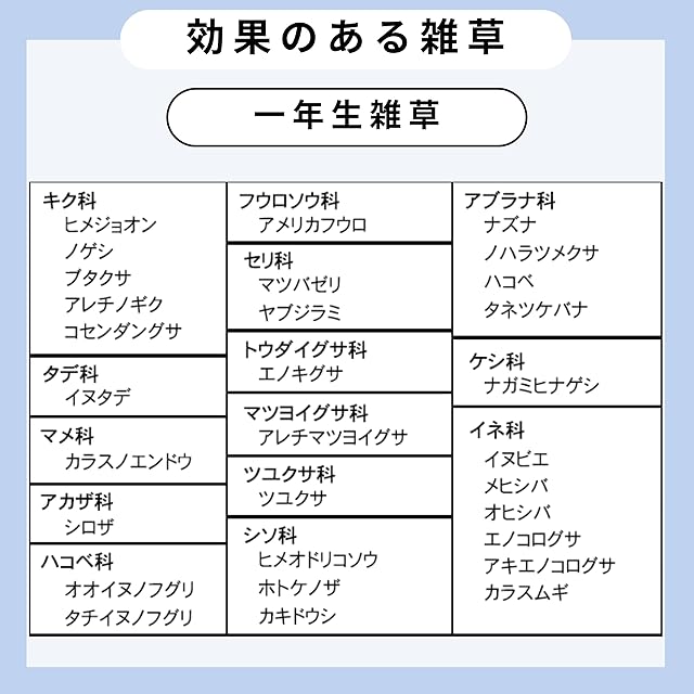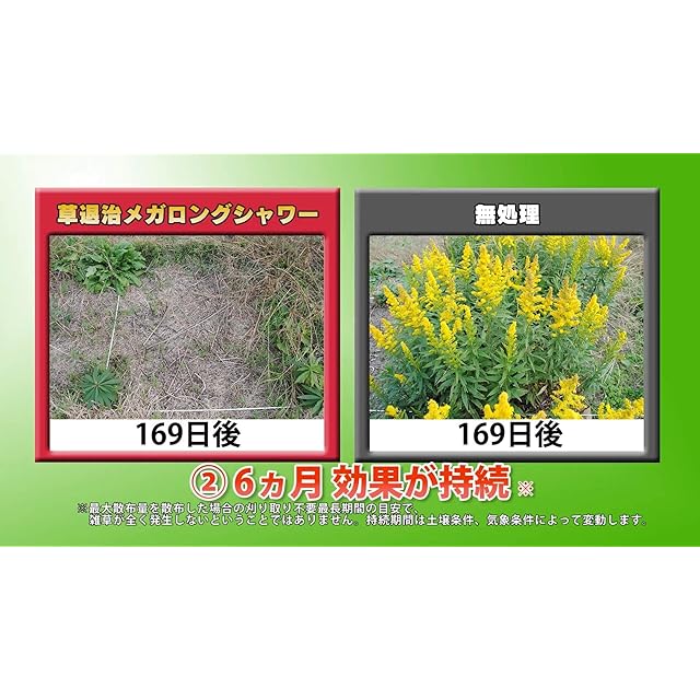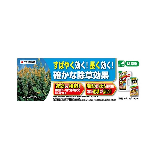 特徴:しつこい雑草の深い根までしっかり枯らす。散布後2~7日で枯れ始め効果が6カ月持続。