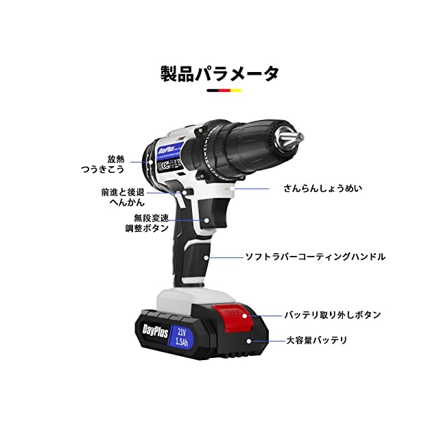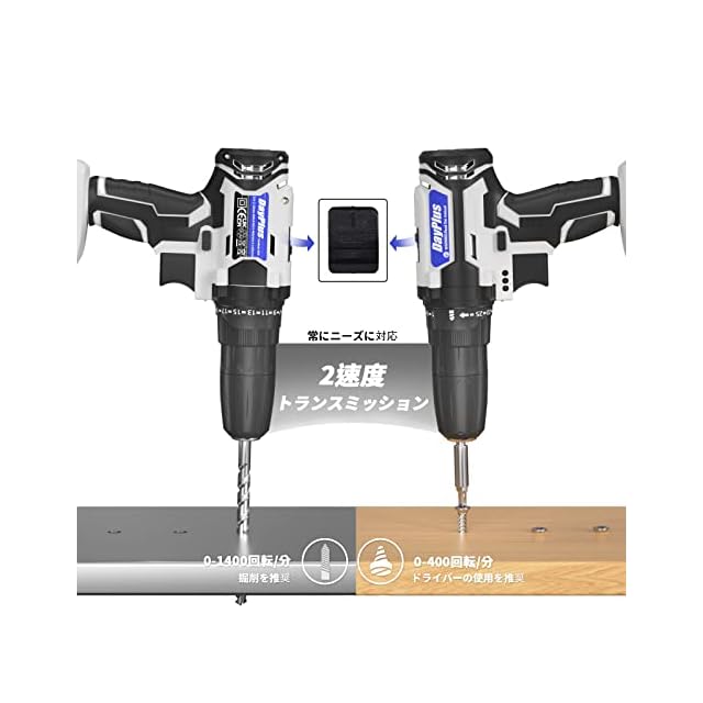 高性能&2段階変速: Day Plusコードレス電動ドリルは、最大トルク45N*mで、穴あけ機能に加え、ネジの締め付け・緩め機能もあり、家庭DIYに一台で対応できます。2段階変速機能は、トリガーの引き加減に応じて0〜1400rpm回転速度を調整できます。木材、メタル、壁面 硬い材料、柔らかい素材などに対応できます