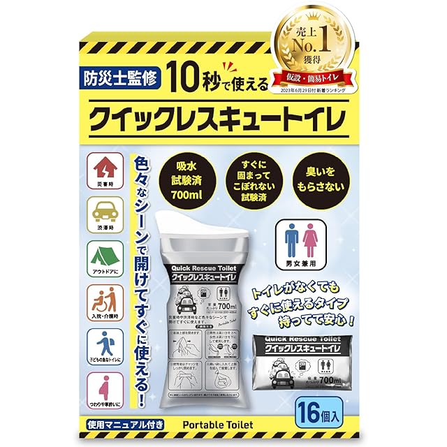 ・【携帯に便利で様々なシーンでも開けてすぐに使える】クイックレスキュートイレは 携帯に便利 な 携帯トイレ です。ポケットティッシュ程のコンパクトサイズで重さもポケットティッシュ2個分程と超軽量なので、ポケットやカバンに入れて持ち運びしやすく、トイレがなくても開けてすぐにご使用できます。そのため、 災害 時はもちろん、 渋滞 時や キャンプ などの アウトドア 、 妊娠中 や 車酔い などの 気分不良時 、 介護 や入院時 、 お子様の急なトイレ など様々なシーンでも使える便利な 防災グッズ です。