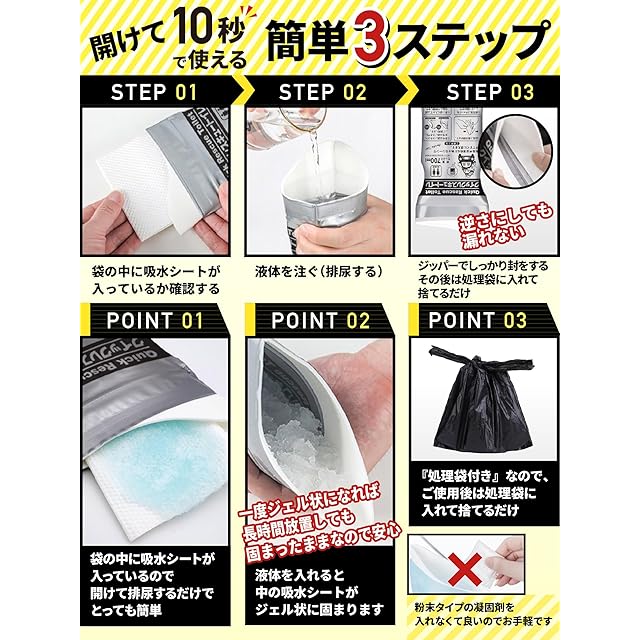 ・【消臭凝固シートで水も臭いも漏れない】消臭凝固シートがセットされているので、後から凝固剤を入れる手間がなく、お手軽にご使用いただけます。排尿するとすぐにジェル状に固まるので、チャックで密封することで水もれや臭いもれすることもありません。ご使用後は付属の処理袋に入れて捨てるだけなので、トイレ後の臭いや水もれ、見た目も気にすることなく廃棄できます。