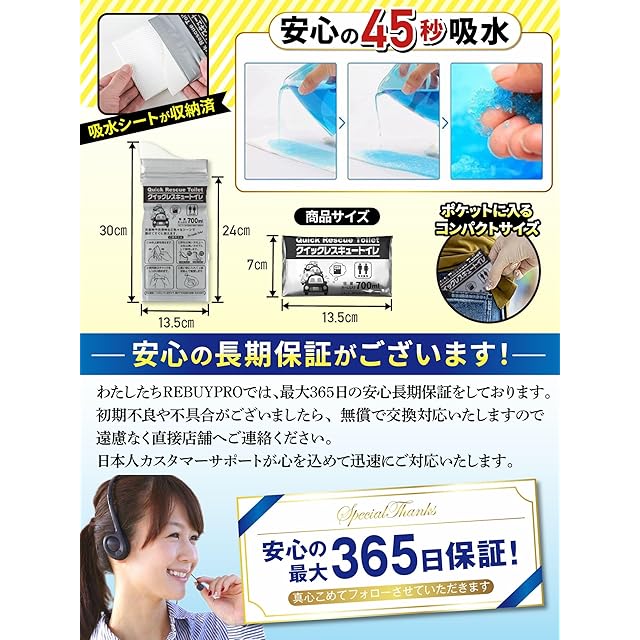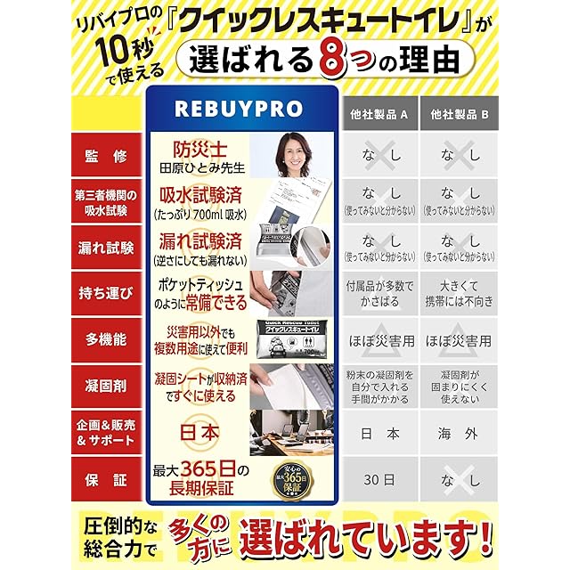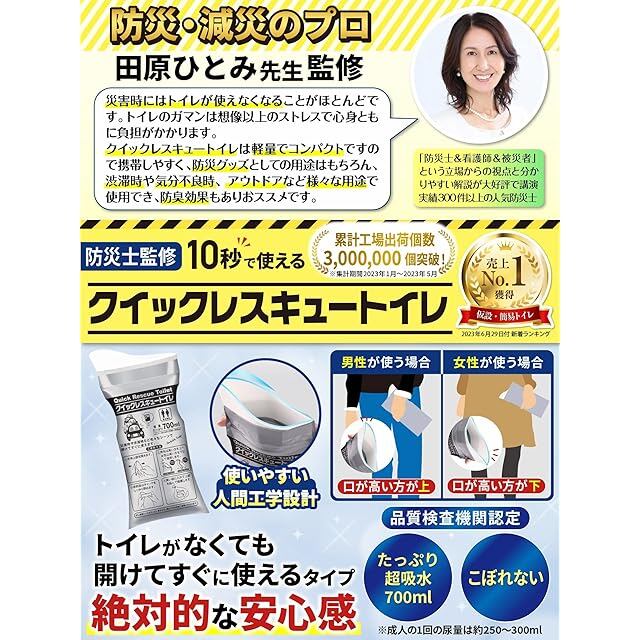 ・【第三者検査機関検査済で安心の高品質】日本国内の第三者検査機関で「700ml吸水試験」、「水漏れ試験」、「ジェル状に固まった後に液状に戻らないか」といった試験を実施して認証済みです。 防災グッズ としての 簡易トイレ は使ってみないと品質が分からないというお客様のお声に寄り添って品質試験によって実証済ですので、より安心してご使用いただけます。