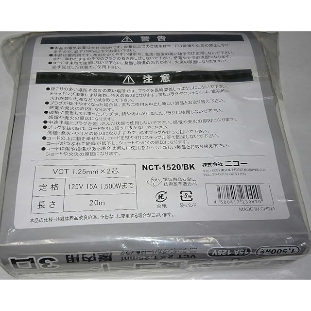 コード長:20ⅿ 差込:3個口 コード:VCT1.25m㎡×2芯