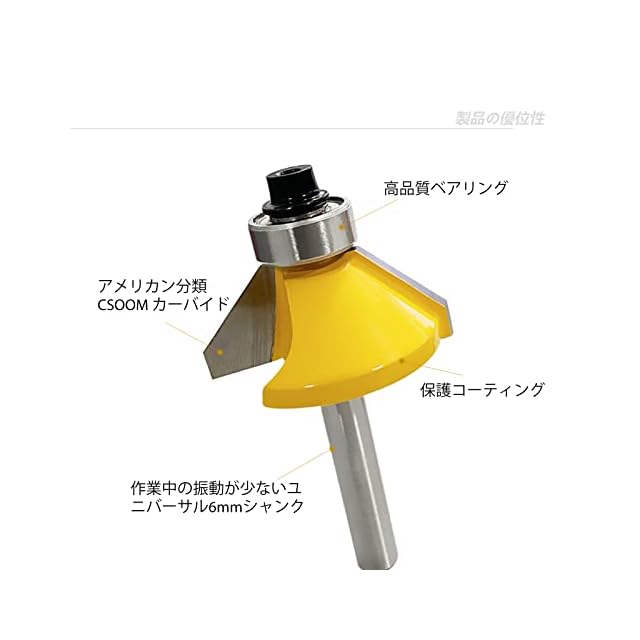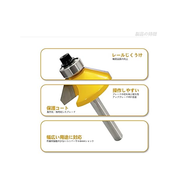 色はイエローで、シャンク径は6㎜、形状は面取りビットです。刃部にはHS2合金を採用し、表面には塗装が施されており、切断速度と耐摩耗性に優れています。使用にはベアリングやガイドベアリングが付属しています。精密に研磨された鋭い先端性能により、より高い安定性を提供し、振動を最小限に抑えます。