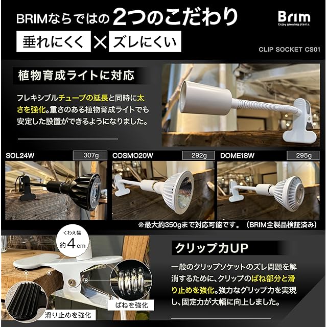 【植物育成ライトに対応 ズレと垂れに強いクランプ式ソケット】強度と太さが増したフレキシブルアームとクランプの組み合わせにより、最大450gの重たい植物育成ライト(E26口金)を支えることが可能です(BRIM新型SOLに対応)。