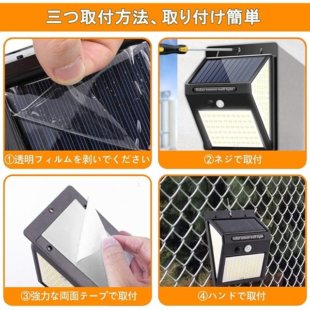 【設置簡単・両面テープ付き】ネジと強力な両面テープは付属しております。設置場所によって、両面テープ、ネジとバンド(別売り)で3つの取付方法があります。※ご注意:付属の両面テープは防水テープではないですが、雨の多い場所に設置する場合、ネジ或いはバンドで取り付けてください。推薦の設置高度3メートル以内、太陽エネルギーを利用していますので、必ず昼間長時間、直射日光が当たる、日当たりの良い場所に設置してください。