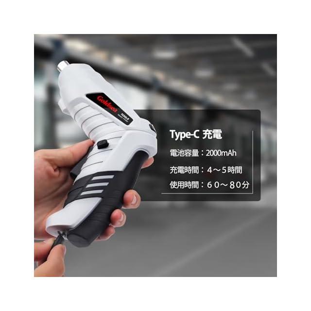 Type-C充電式、60分連続使用: Type-C充電式電動ドライバーなので、電池交換不要、繰り返し充電可能。従来1000 mAh容量電池と比べて、弊社のドライバーはバッテリー容量1.5倍!1500 mAh大容量バッテリーで、60分連続使用できます!作業効率アップ!高速連続運転でモーターが過熱してしまい、製品寿命が短くなるのを防ぐため、1分間連続使用した後は、製品を一時休止してください