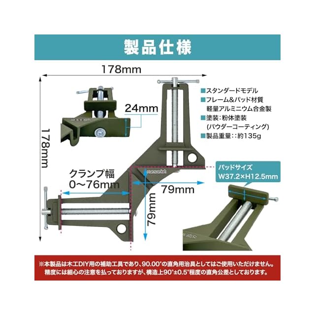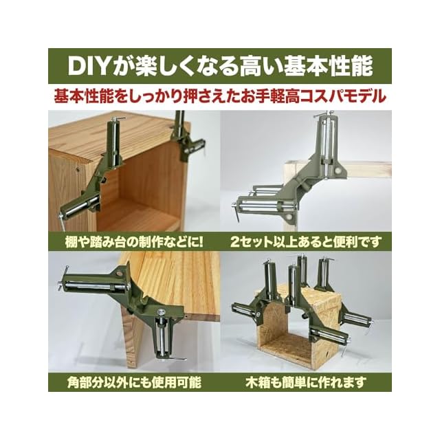 【使用用途】箱物、本棚、収納棚、机の引き出し、額縁、ベンチ、棚受けの制作など、直角での固定が必要な作業に重宝します。直角での接着や釘打ちネジ留めだけでなく、のこぎりでの切断作業時の固定など、幅広い用途で使用可能です。