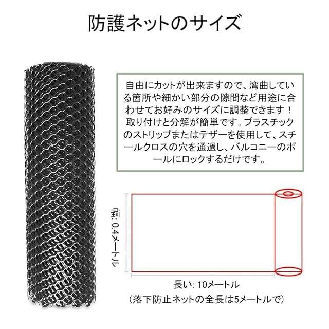 【適切なサイズ】穴0.8cm、 幅40cm×長さ10m。すべてのドア、窓、廊下、バルコニー、手すりに適しています。引っ張れば少し伸びる性質なので、ハサミでパチンと簡単に好みの形に変えられますし結束バンドの固定も凄く固いです。