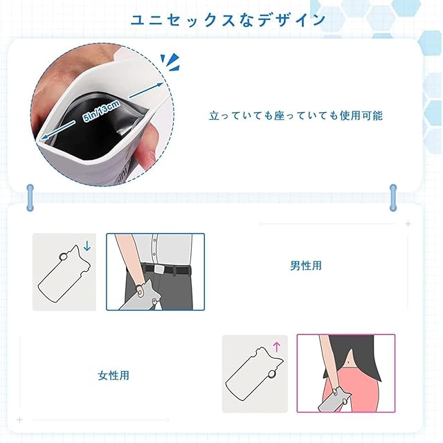 【大容量・男女老若兼用】使い捨て携帯トイレの容量が大きくて、700mlがあります。さらに2回或いはフルまで使えます。男女兼用の設計で、男性、女性、子どもや患者さんが適用可能。女性にも使いやすくて、立ったままで使用可能、非常に便利です。