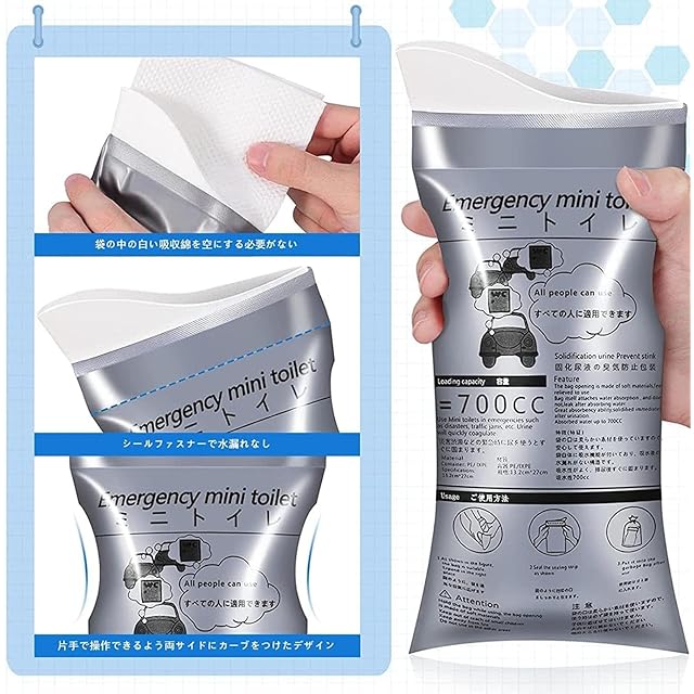 【使用便利・ポータブル】簡易トイレを開くだけで使用可能(脱脂綿製パッドを出さなくても大丈夫です)。巧妙のバックルと受け口の設計で、片手で使用可能。折り畳んだらコンパクトになり、ポケット、財布、カバンや車のグロブボックスに収納可能。