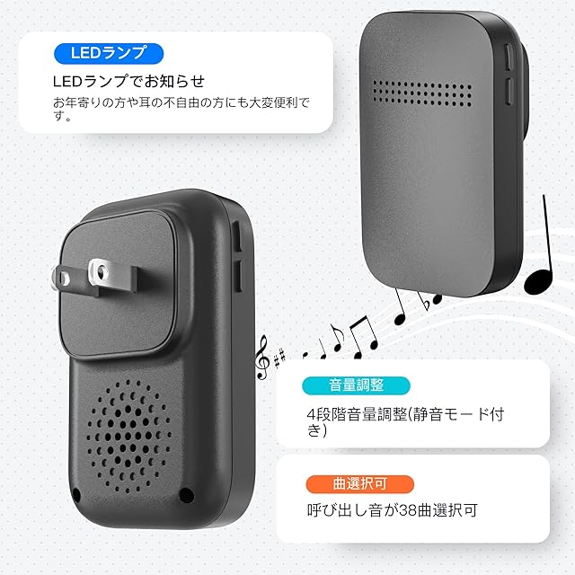 【38曲4段階音量調節と光でお知らせ】このワイヤレスチャイムの送信機を押すと、受信機が音を立てながら両方のライトが点滅してお知らせします。 この玄関チャイムは38種類の音色の曲と0-100DBの4段音量を選ぶことができます。自分の好みや使う場所に合わせて、適切な音量を選ぶことができて、とても便利です。
