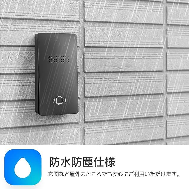 【耐水防塵仕様】この玄関チャイムの送信機はの耐水防塵内部構造を採用しており、屋外や浴室など水がかかる場所で使用しても大丈夫です。雨や水しぶきが直接的にドアベルにかかっても、内部の回路や部品が損傷することなく正常に機能します。これにより、長期間にわたって信頼性のある通知装置として使用できます。