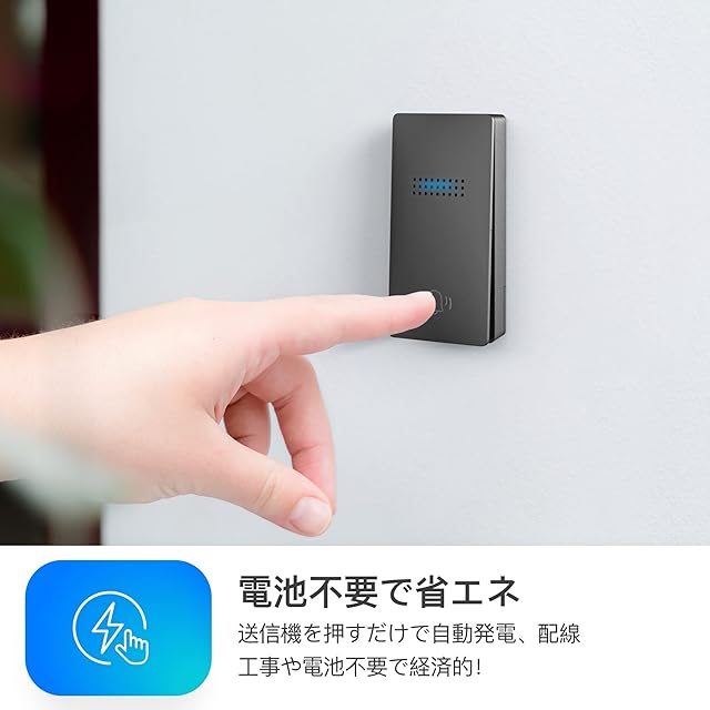 【電池不要&簡単取付】自動発電の送信機なので電池不要で、ボタンが押されたときのみ電力を生成します。このため、メンテナンスや交換の頻度が低く、長い寿命を持つことができます。 また両面テープとネジが付属しており、配線不要で簡単に取り付けることができます。 受信機はコンセントに差し込むだけ、お子供や年寄りの方がご利用できます。