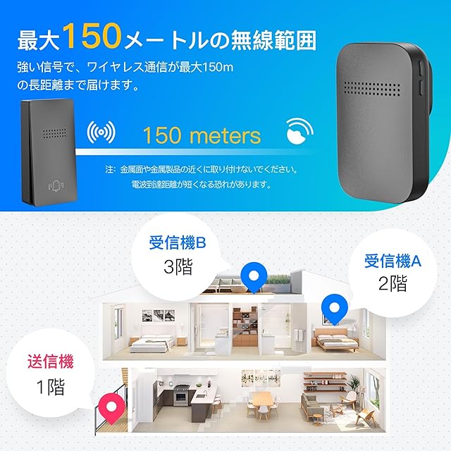 【安定受信&記憶機能】このドアチャイムは高感度の受信機を採用して、壁を通して安定的に受信することができます。屋内での使用はもちろん、2階建てでの使用も可能です。 曲を記録できるメモリー機能付き、場所を変えて使うときは繰り返し作業をしなくて使いやすいです。