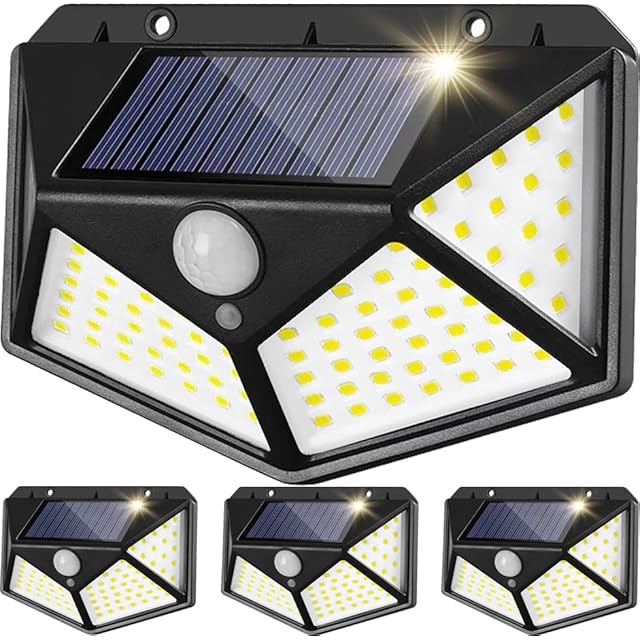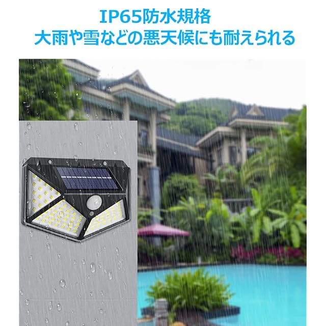 【高輝度100LED・4面発光・270°照明】屋外防水ソーラーライトは100個高品質LEDが揃え、発光効率の高い上に、4面発光で照明角度が270°以上に達します。色温度は6500K、昼光色で昼のように所々を照す。発熱が少なく、低赤外線・低紫外線で虫を寄せ付けにくい。人感センサーライトの検出角度が160°になったので、ほぼすべての角度から不審者や犯罪者を威嚇できます。屋外に設置して防犯対策効果が抜群です。(設置前に、できるだけ日当たりの良い場所を選んでください)