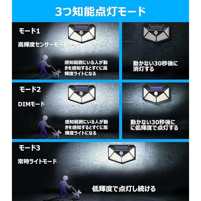 【三つの知能モード搭載】センサーライト屋外は高輝度センサーモード、DIMモード、常時ライトモード3つの知能点灯モードが搭載されます。スイッチを一回目押すと「高輝度センサーモード」になり:夜や暗い場所ではライトが点灯せず、感知範囲にいる人が動きを感知するとすぐに高輝度ライトに切り替わります、動かない30秒後に消灯します。二回目押すと「DIMモード」になり:昼間と明るい場所では消灯します。夜間で低輝度で点灯しますが、動きを検知すると、ランプが高輝度になり、動きがなくなったら、30秒後に低輝度で点灯します。三回目押すと「常時ライトモード」になり:夜間で低輝度で点灯し続けます。*センサーライトをご希望の場合は、高輝度センサーモードとDIMモードをお選びください。