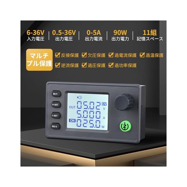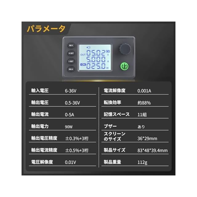 【製品仕様】入力電圧範囲:DC6-36Vに対応し、出力電圧:DC0.5-36Vおよび出力電流:0-5Aが調整可能です。出力電力は90Wで、これにより、様々なアプリケーションにおいて安定した電力供給が可能です。