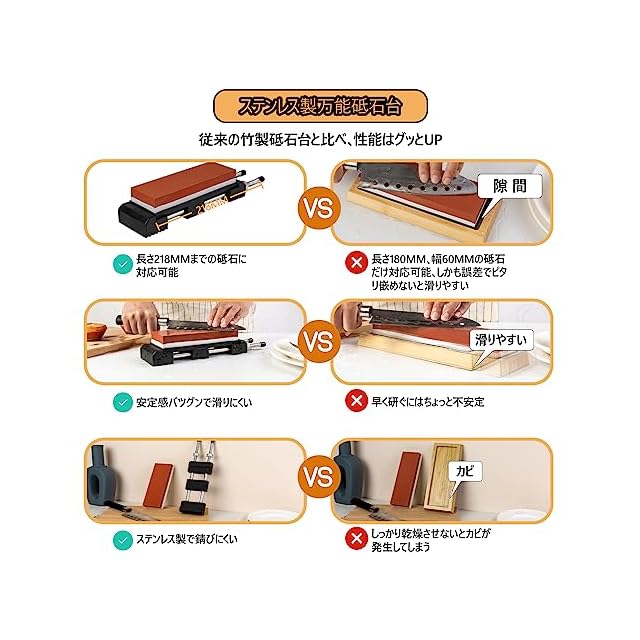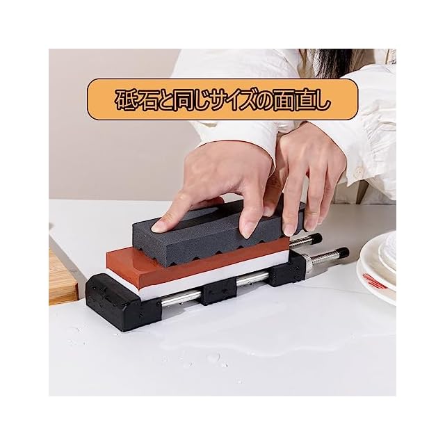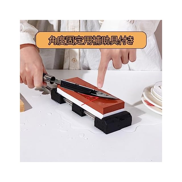 【初心者プロ向き】:この研ぎ石は、角度固定用刀補助具付きのでプロはもちろん、初心者の方でも簡単に使いこなせる。または、万能砥石台つきので、従来のゴムの滑り止めと比べ、研いでいる最中に包丁が手元からずれて大事故になるのを防げます。とても安心てきます。※重要事項※本砥石台は、当社オリジナル商品となっており、コピー対策として外観の意匠登録申請済みです(意匠登録番号第1747826号)。